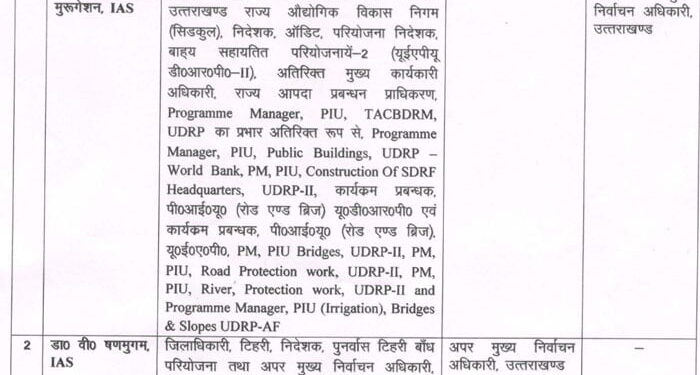 आईएएस अधिकारी प्रभारी सचिव एमए मुरूगेशन को वर्तमान विभागों के साथ अपर मुख्य निर्वाचन अधिकारी उत्तराखंड की जिम्मेदारी भी सौंपी गई है।