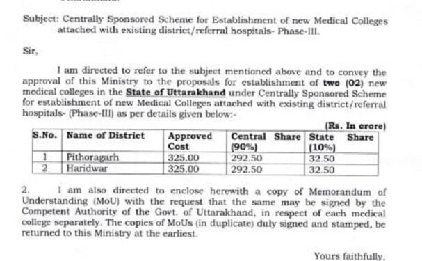 देश भर में कोरोना संक्रमण के बीच केंद्र के पत्र में कहा गया है कि केंद्र पोषित योजना के अंतर्गत उत्तराखंड में दो मेडिकल कालेजों को मंजूरी दी जा रही है। पिथौरागढ़ जिले में मंजूर मेडिकल कालेज की अनुमानित लागत 325 करोड़ रुपये जिसमें नब्बे प्रतिशत अर्थात 292 करोड़ रुपये केंद्रांश और दस प्रतिशत 32 करोड़ रुपये राज्यांश होगा। हरिद्वार में मंजूर मेडिकल कालेज की अनुमानित लागत भी 325 करोड़ होगी। केंद्र तथा राज्य के बीच इसके लिए एक एमओयू हस्ताक्षरित किया जाएगा।