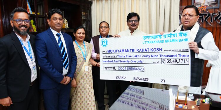 मुख्यमंत्री श्री पुष्कर सिंह धामी से शनिवार को मुख्यमंत्री कैंप कार्यालय में उत्तरांचल ग्रामीण बैंक के प्रतिनिधियों ने भेंट की। इस दौरान बैंक प्रतिनिधियों ने उत्तराखंड में आपदा प्रभावितों की सहायता एवं पुनर्निर्माण कार्यों के लिए ₹ 35,49,371 की धनराशि मुख्यमंत्री राहत कोष में प्रदान की।