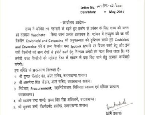 मुख्य सचिव ओमप्रकाश के हस्ताक्षरों से जारी एक आदेश में कहा गया है कि कोविड-19 के बढ़ते प्रकोप को देखते हुए राज्य के नागरिकों का टीकाकरण करना बहुत आवश्यक है। देश में कोवीशील्ड तथा कोवैक्सीन की अनुपलब्धता के चलते विदेशों से वैक्सीन आयात करना आवश्यक हो गया है। इसके लिए कोवीशील्ड तथा कोवैक्सीन के अलावा स्पुतनिक जैसी वैक्सीन को आयात किया जा सकता है।
