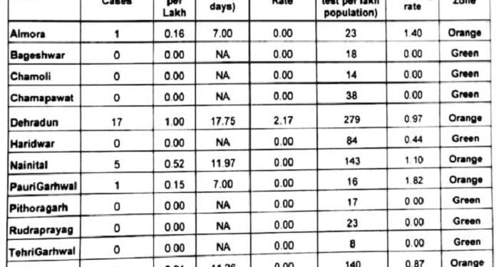 देहरादून। लाकडाउन-4 में उत्तराखंड के छह जिले औरेंज और सात ग्रीन की श्रेणी में आए हैं। राज्य का कोई भी जिला रेड जोन में शामिल नहीं है। खास बात यह है कि रेड जोन में शामिल उत्तराखंड का एक मात्र जिला हरिद्वार रेड से सीधे ग्रीन बना है। देहरादून और नैनीताल पहले से ही औरेंज श्रेणी में थे दोनों ही जिले अभी भी औरेंज में ही बने हुए हैं जबकि अल्मोड़ा, उधमसिंह नगर, पौड़ी गढ़वाल, उत्तरकाशी, तीन पर्वतीय तथा एक मैदानी जिले औरेंज श्रेणी में शामिल हुए हैं।