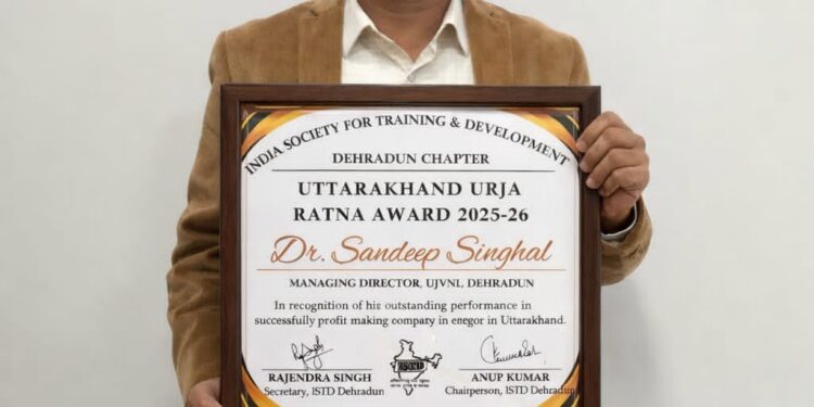 यूजेवीएन लिमिटेड के प्रबंध निदेशक डॉ. संदीप सिंघल को इंडियन सोसाइटी फॉर ट्रेनिंग एंड डेवलपमेंट (ISTD) के देहरादून चैप्टर द्वारा “Transforming Work and Workforce Expectations:The New People Agenda” विषय पर आयोजित कॉन्फ्रेंस में ऊर्जा के क्षेत्र में उनके उत्कृष्ट योगदान के लिए प्रतिष्ठित “उत्तराखंड ऊर्जा रत्न पुरस्कार 2025-26” से सम्मानित किया गया। डॉ. सिंघल को यह सम्मान यूजेवीएन लिमिटेड को ऊर्जा क्षेत्र में सतत् लाभ कमाने वाले निगम के रूप में स्थापित करने में उनके उल्लेखनीय योगदान के लिए प्रदान किया गया। डॉ . संदीप सिंघल के कुशल नेतृत्व में यूजेवीएन लिमिटेड ने वित्तीय रूप से सुदृढ़ता प्राप्त करने के साथ ही प्रदेश की ऊर्जा क्षमता में वृद्धि तथा तकनीकी उन्नयन की दिशा में भी कई महत्वपूर्ण कार्य किए हैं। यूजेवीएन लिमिटेड की वित्तीय स्थिति काफी मजबूत है तथा निगम कई वर्षों से राज्य सरकार को उनके पूंजी निवेश पर लगातार लाभांश देता आया है।