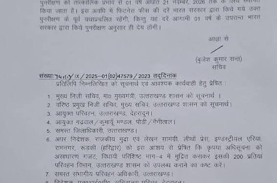 मुख्यमंत्री श्री पुष्कर सिंह धामी के निर्देश पर राज्य सरकार ने उत्तराखंड के वाहन स्वामियों को महत्वपूर्ण राहत प्रदान करते हुए पुराने (15 वर्ष) कमर्शियल वाहनों की फिटनेस फीस में वृद्धि को आगामी 21 नवम्बर 2026 तक स्थगित कर दिया है। इस संबंध में परिवहन विभाग द्वारा अधिसूचना जारी कर दी गई है। अधिसूचना सचिव परिवहन श्री बृजेश कुमार संत द्वारा जारी की गई।