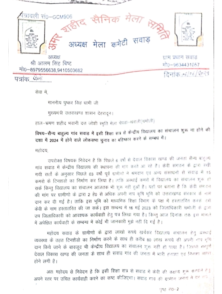 अमर शहीद सैनिक मेला समिति सवाड़ के अध्यक्ष आलम सिंह बिष्ट, जिला पंचायत सदस्य आशा धपोला,क्षेत्र पंचायत सदस्य दीक्षा मेहरा,ग्राम प्रधान कंचना मेहरा, युवक मंगल अध्यक्ष प्रमोद धपोला, ममंद अध्यक्ष बसंती मेहरा आदि ने बताया कि वें लगातार आसन्न शिक्षासत्र से सवाड़ में केवी की कक्षाएं संचालित करने को लेकर केवी संगठन, केंद्र सरकार, राज्य के मुख्यमंत्री एवं अन्य मंत्रियों से करते आ रहें हैं। कहा कि इस सत्र में केवी की कक्षाएं शुरू नही हुई तों सवाड़ गांव सहित आसपास के गांवों के ग्रामीण 2024 के लोकसभा चुनाव का बहिष्कार किया जाएगा इस संबंध में मुख्यमंत्री पुष्कर सिंह धामी को पिछले दिनों शौर्य मेले के दौरान एक पत्र भी सौंपा है।