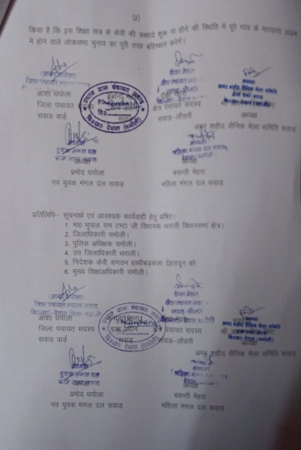थराली। आगामी शुरू होने वाले शिक्षा सत्र में राज्य के सैन्य बाहुल्य गांवों में सुमार सवाड़ में केंद्रीय विद्यालय नही खोले जाने पर सवाड़ सहित आसपास के गांवों के ग्रामीण आगामी 2024 में होने वाले विधानसभा चुनावों के बहिष्कार की रणनीति बनाने में जुट गई हैं। इस संबंध में ग्रामीणों ने एक चेतावनी पत्र शासन, प्रशासन को भेज दिया हैं।
