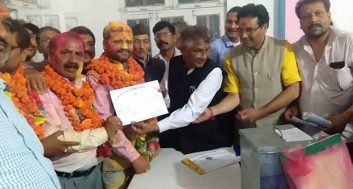 फोटेा–विजयी प्रत्याशियों को प्रमाण पत्र देते मुख्य चुनाव अधिकारी माधव प्रसाद सेमवाल।