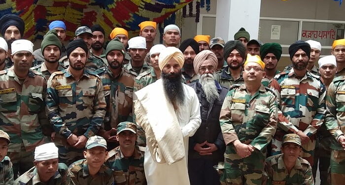 फोटो–गुरूद्वारा गोविंदघाट में अरदास के बाद पहले सैनिक दल के साथ ट्रस्ट के मुख्य प्रंबधक सरदार सेवा सिंह