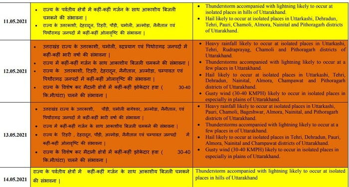 13 मई को उत्तरकाशी, पौड़ी, चमोली, बागेश्वर, अल्मोड़ा, चंपावत, नैनीताल तथा पिथौराग़ढ़ में भारी बारिश हो सकती है। राज्य के टिहरी, देहरादून, पौड़ी, अल्मोड़ा, नैनीताल, चंपावत में कहीं-कहीं ओलावृष्टि होगी। मैदानी क्षेत्रों में झोकेदार हवा चलेगी।