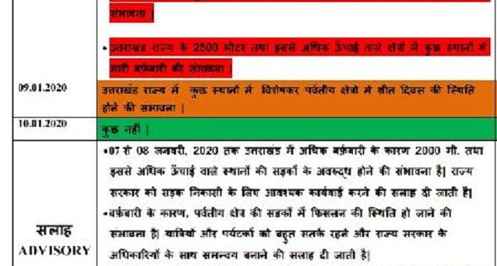 9 जनवरी को राज्य में खासकर पर्वतीय क्षेत्रों में शीतलहर तीक्ष्ण होने की संभावना है। मौसम विभाग के अनुसार 10 जनवरी को मौसम सामान्य हो सकेगा। मौसम विभाग ने चेतावनी तथा एडवायजरी जारी की है। जिसमें कहा गया है कि बर्फबारी के कारण अधिक उंचाई वाले स्थानों पर ऐहतियातन बचाव कार्य के लिए प्रशासन तैयार रहे।