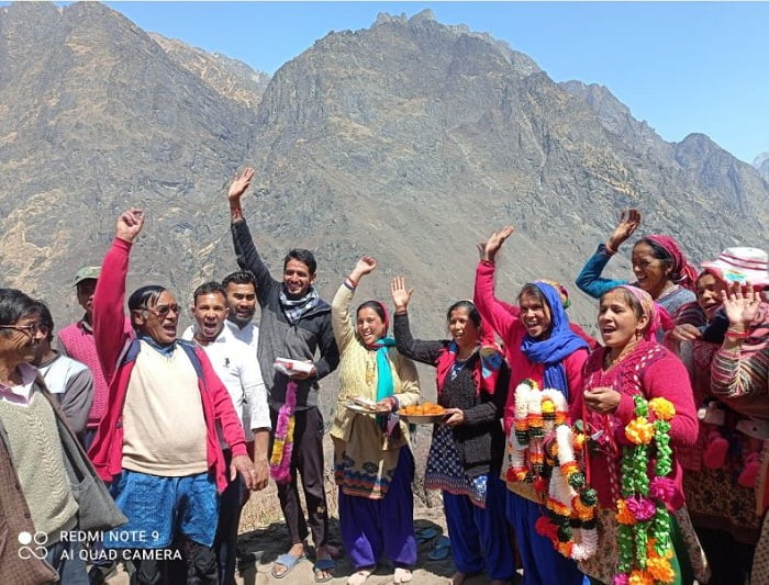 02- पहली बार जेसीबी मशीन गाॅव मे पहुंचने पर भगवान भविष्य बदरी का जयकारा लगाते ग्रामीण ।