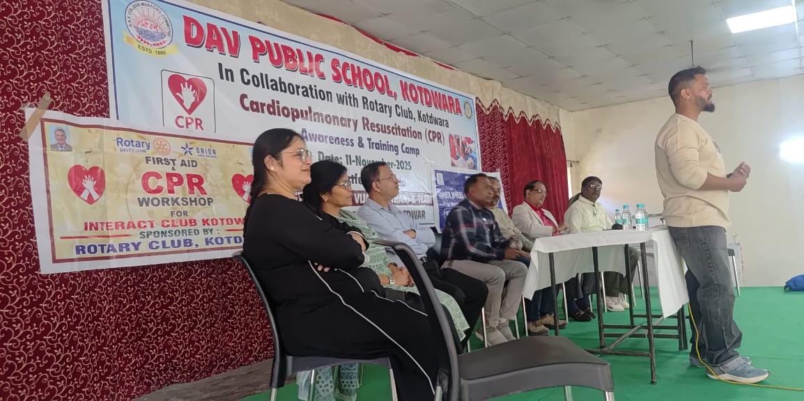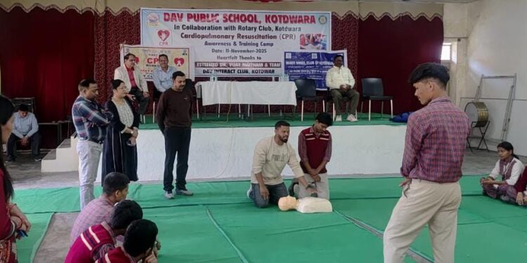 कोटद्वार। रोटरी क्लब कोटद्वार व इनरव्हील क्लब पिंक के तत्वावधान में द्वितीय चरण में इन्ट्रेक्ट क्लब डी.ए.वी. पब्लिक स्कूल के छात्र-छात्राओं को फर्स्ट एड एवं सीपीआर के सम्बन्ध में जानकारी देने हेतु एक कार्यशाला का आयोजन किया गया।